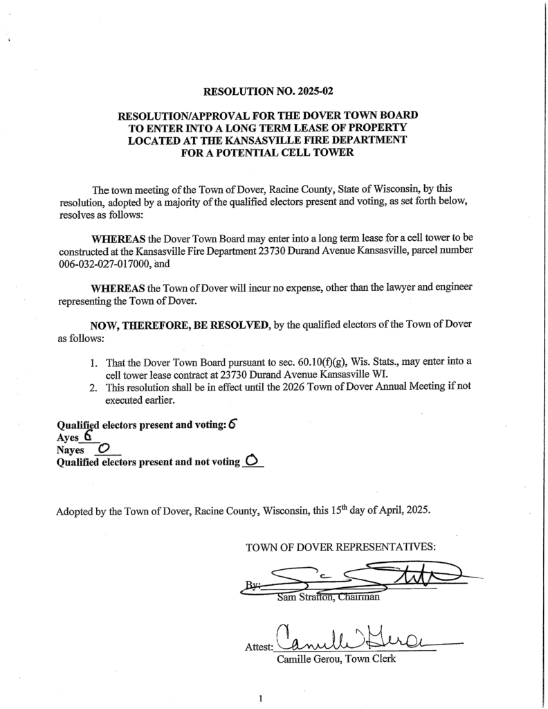 Posted on May 5, 2025, Edited May 5, 2025 by Camille Gerou Resolution 2025-02 Approval of Potential Cell Tower
